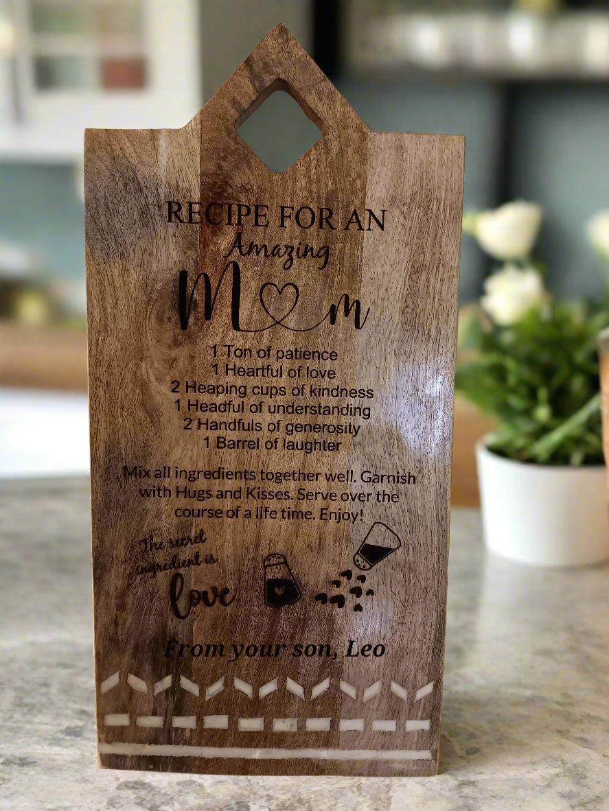 This beautiful board with inlay details engraved with a sweet recipe poem for moms is the perfect gift to remind your mom how much she means to you!